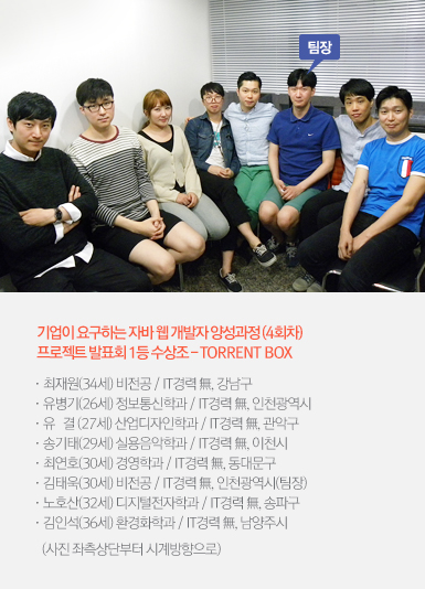 | 김태욱 | 6개월 동안 같이 공부하며 정이 많이 들었는데, 오늘이 마지막 날이라니 섭섭해요. 도중에 포기하는 사람 없이 마지막까지 열심히 해줘서 감사하고, 간간히 만나서 회포 푸는 자리를 가졌으면 좋겠어요. |
