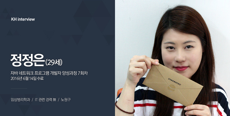 안녕하세요~ 정정은입니다. 임상병리학을 전공했으나 자바를 배우고 싶어서 KH 교육과정을 이수했습니다.