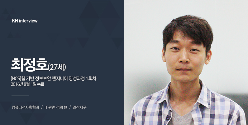 안녕하세요! 저는 컴퓨터 전자학과를 졸업한 최정호라고 합니다. 졸업 후에 어떤 분야로 취업해야 좋은지 고민을 많이 하다가IT산업이 비전 있다고 생각이 들어서 보안과정을 공부했습니다. 지금은 KH학생으로서 자부심을 가지고, 취업을 위해 노력하고 있습니다.