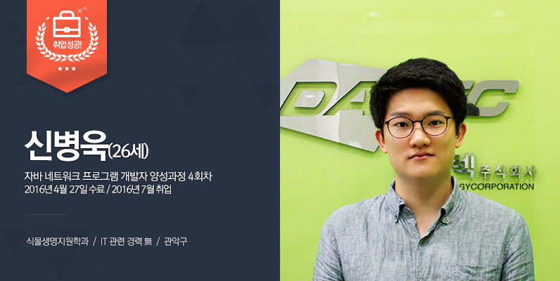 안녕하세요 저는 KH정보교육원에서 2015년 10월부터 2016년 4월까지 6개월동안 진행한 '자바 네트워크 프로그램 개발자 양성과정'의 수료생 신병욱입니다. 현재는 구로디지털단지에 있는 IT기업인 데이텍에 다니고 있습니다.