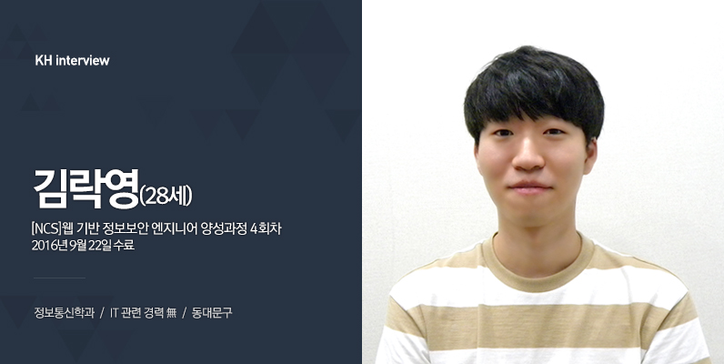 저는 28살이고요. 정보통신학과를 전공했습니다. 보안에 대해 더 심도 있게 공부하고 싶어서 KH정보교육원에 왔습니다.