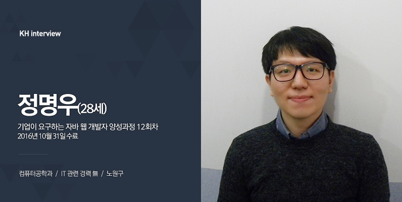 안녕하세요. 저는 컴퓨터공학과를 전공한 정명우이고요. 졸업 후에 6개월 정도 취업 활동을 했지만, 생각보다 쉽지 않았어요. 그래서 저의 부족한 부분을 채우고 싶어서 KH정보교육원에 오게 되었습니다.