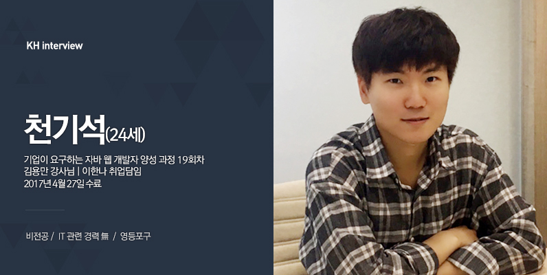 네 안녕하세요~ 영등포에 사는 24살 천기석입니다. 웹 개발에 관심이 생겨서 학원을 찾다가, 지인의 추천으로 KH정보교육원에 오게 됐어요.