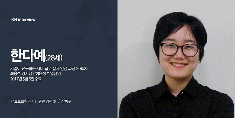 안녕하세요~ 28살 한다예입니다. 전공은 정보보호학과지만 다른 업종에서 일하다가, 주변 사람들의 권유로 결국 다시 IT 계열로 오게 됐습니다.(웃음)