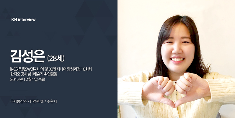 안녕하세요. 김성은이라고 합니다.(웃음) 저는 무역회사에서 2년 정도 일하다가 자바에 눈을 떠서 KH정보교육원에 오게 됐습니다.