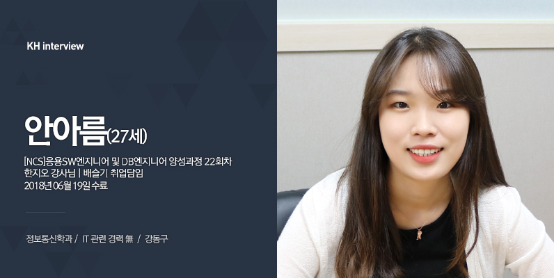 제가 KH정보교육원 오기 전에 간호조무사 일을 하고 있었어요. 환자를 관리하는 프로그램이 있었는데, 프로그램을 사용할수록 내가 만약 개발자라면 이런 기능도 추가했을 텐데 라는 생각이 들더라고요. 그러다 프로그램을 개발하는 직종이 궁금해져서 알아봤어요. 알아볼수록 프로그램을 개발한다는 직업이 너무 멋있고, 흥미로워서 관심이 생겼어요.