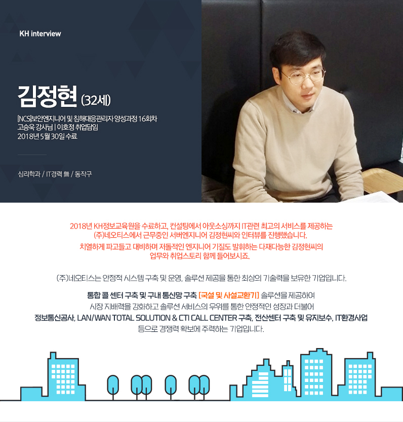 네, 안녕하세요. 저는 운 좋게도 수료한날 오전에 채용통보를 받고 2018년 6월 4일에 (주)네오티스에 입사한 김정현입니다. 시스템 통합 SI팀으로 입사 해서 서버엔지니어로 근무하고 있어요.