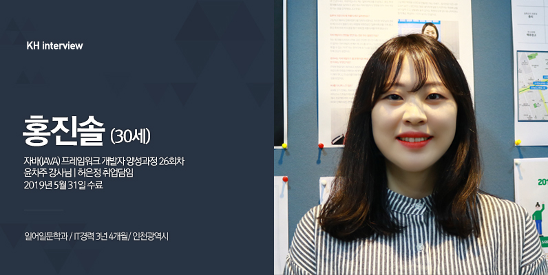 제가 일본에서의 IT 경력이 있지만, 여러 가지 직무의 일을 다양하게 했었어요. 서버 수리도 해보고, 네트워크 일도 해보기도 했죠. 한국에 돌아와서는 웹 개발을 전문으로 하는 개발자로 일을 하고 싶었어요. 그러기에는 자바기술이 부족한 것 같아서, 학원을 알아보던 중 KH가 규모도 있는 만큼 잘 가르친다는 소개를 받고 KH에 오게 됐습니다.