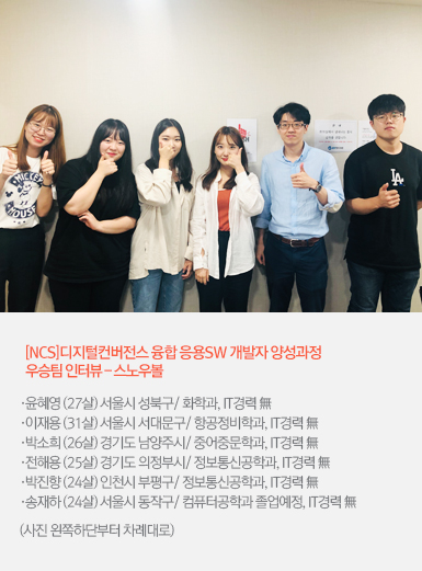 처음에는 새로운 환경이 어색하고 한 번도 배워보지 못한 새로운 과정을 배운다는 것에 막막한 심정도 있었어요. 하지만 지금 생각해보니 다들 열심히 공부해서 많이 발전한 것 같아요. 6개월 동안 오전 9시부터 저녁 9시까지 붙어있던 친구들하고 이제 헤어지게 된다니 아쉬운 마음도 있지만, 다들 좋은 곳에 취업해서 웃는 얼굴로 다시 만났으면 좋겠습니다! |