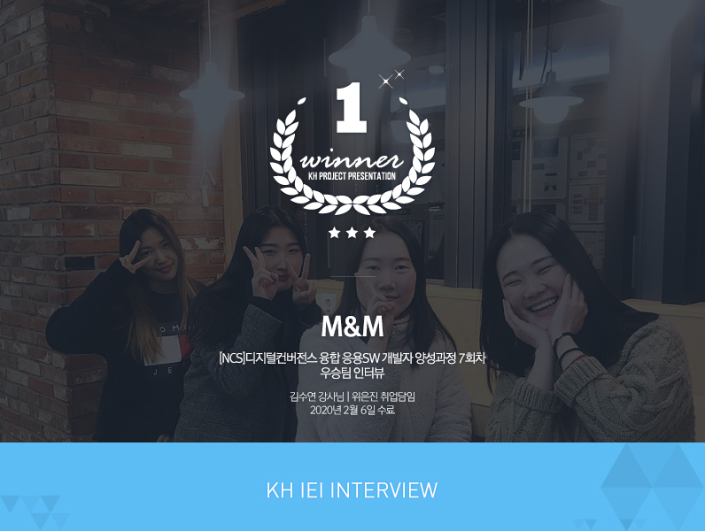 안녕하세요~! 팀장인 저를 비롯하여 주혜원, 홍찬미, 이소희로 구성된 M&M 팀입니다. 저희는 Meet Me! 라는 프로젝트를 준비했는데요. 생각지도 못했는데, 우승까지 하게 돼서 너무 좋습니다! |