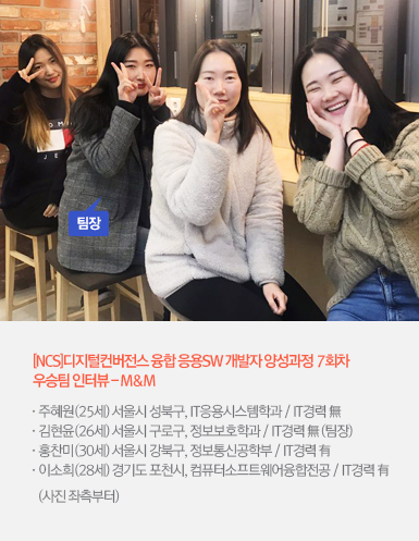 안녕하세요. M&M팀 반갑습니다~ 모두 여성분들로 구성된 예쁜 팀이네요.
