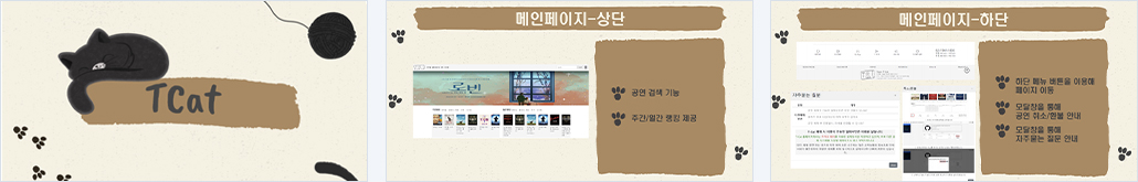 Main - 뮤지컬, 클래식/ 무용, 연극, 전시회 검색 - 주간/ 일간 랭킹 제공 - 인기/ 개막예정/ 종료임박 공연 제공 Menu - 각 카테고리별 페이지 - 작품명으로 공연 검색 Detail - 공연 상세 정보 제공 - Q&A - 찜하기 - 별점 - 관람후기 - 지도 api를 이용한 공연장 위치 제공 - KakaoPay를 통한 결제 - 포인트 사용 할인 Login/ Sign - 회원가입, 로그인, 로그아웃 - 아이디 찾기, 비밀번호 찾기 - 주소 API를 사용해 편리한 주소 검색 기능 MyPage - 회원 정보 수정 - 예매 내역 확인 - 취소 내역 확인 - 예매 취소하기 - 나의 정보 확인 - 1:1 문의하기 - 문의 내역 조회 AdminPage - 매출 정보 확인(통계/ 그래프) - 회원관리(블랙리스트) - 게시물 관리 - 광고 관리 - 공지사항 관리 - 1:1 문의 답변 |
