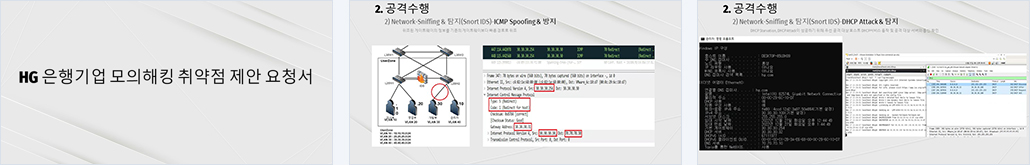 HG은행이 미연에 보안사고를 방지하여 고객에게 안심을 제공하고자 기업의 보안체계를 한 차례 검토하고자 하였다. HG은행은 회사 보안에 어떤 취약점이 있는지 짧은 기간 내에 알 수 있는 방법을 요구하였고, 따라서 내부 시스템 정보를 제공받아 해킹을 시도하는 White Box Testing을 이용하여 회사 보안 체계의 취약점들을 분석 후 ESM, UTM, WAF, SNORT(IDS, IPS), NAC, FWLB, 장비 이중화 보안장비 등을 도입하여 보안 인프라를 재구성하기로 하였다. |