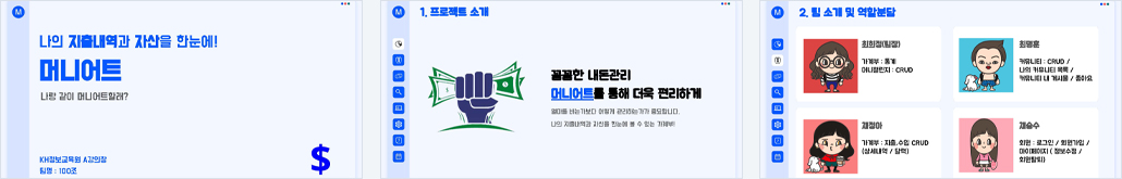 - 손쉬운 가계부 수입 / 지출 작성 - 챌린지를 통한 목표설정 - 커뮤니티를통한 회원간의 소통 - 기간별 통계를 통한 가시성 - 카테고리 분류를 통한 내역 세분화 |