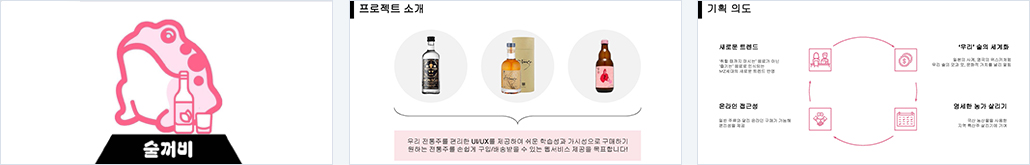 우리 전통주를 편리한 UI/UX를 제공하여 쉬운 학습성과 가시성으로 구매하기 원하는 전통주를 손쉽게 구입 / 배송받을 수 있는 웹서비스 제공을 목표합니다! |