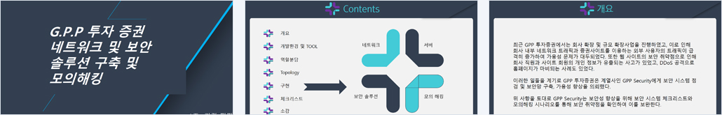 개요 "최근 GPP 투자증권에서는 회사 확장 및 규모 확장사업을 진행하였다. 이로 인한 회사 내부 네트워크 트래픽과 증권사이트를 이용하는 외부 사용자의 트래픽이 급격히 증가하여 가용성 문제가 대두되었다. 또한 웹 사이트의 보안 취약점으로 인해 회사 직원과 사이트 회원의 개인 정보가 유출되는 사고가 있었고, DDoS 공격으로 홈페이지가 마비되는 사례도 있었다. 이러한 일들을 계기로 GPP 투자증권은 계열사인 GPP Security로 보안 시스템 점검 및 보안망 구축, 가용성 향상을 의뢰했다.