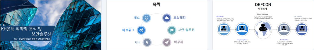 개요 KH 금융은 최근 SQL Injection, DDOS 공격등 웹공격으로 인한 피해를 입어 회사내부망이 취약하다고 느끼고, 내부망에대한 보수가 필요하다고 판단하여 취약점을 찾고, 보완개선 하기 위한 요구명세서를 만들어 보안회사(데프콘)에 의뢰를 하였다. 이에 데프콘회사는 KH 전자 요구명세서를 기반으로 모의해킹을 통하여 네트워크망에대한 취약점을 분석하였고, 보안솔루션을 통한 보안인프라를 구축하려한다. 따라서 본 프로젝트의 목표는 OWASP TOP10과 국정원 선정 8대 취약점을 기반으로 한 모의해킹 및 주요통신기반시설 취약점 가이드를 기반으로 한 체크리스트를 통해 취약점을 점검하고, 발견된 취약점을 다양한 보안솔루션을 통해 정보보호 3요소 CIA(무결성,가용성,기밀성)를 보장 하는것이다. 또한, 웹공격(SQL Injection,XSS등)에 대한 탐지와 차단을 위한 소규모 관제시스템을 설계하여 안전한 서비스 운영이 가능하도록 설계한다. 사전에 침해사고 공격시나리오를 진행함으로써, 공격원리, 해당 패킷의 분석, 취약점 보안을 통한 보안인프라망을 구축하는 것을 최종 목표로 한다.
