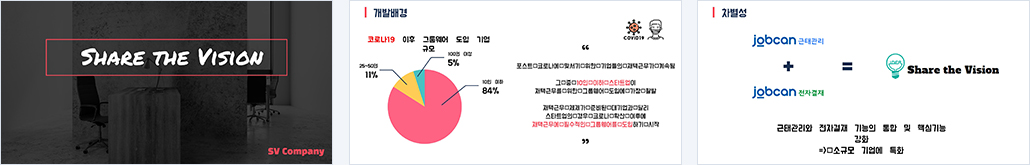 코로나 장기화로 인한 재택근무가 점차 뉴노멀로 자리 잡는 가운데, 정해진 근무 시간과 장소에 대한 개념 또한 변화. 재택근무 체제가 준비된 대기업과 달리 10인 이하 스타트업의 협업 소프트웨어(그룹웨어) 의 필요성이 대두됨. 근태관리와 전자결재 기능의 통합 및 핵심기능을 강화한 플랫폼을 사용하여 체계적인 인사관리와 부서 및 개인별 일정관리를 통해 비대면으로 즉각적인 피드백 을 주고 받을 수 있으므로 업무에 대한 능률 향상. |