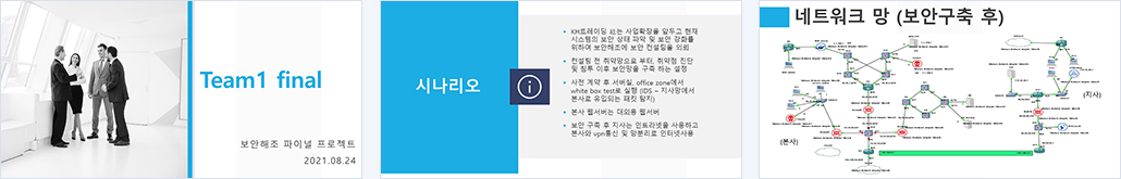 개요 취약한 네트워크의 모 사가 기본적인 보안 구성을 위해 보안컨설팅을 의뢰했다. 모의 해킹을 통해 현재 네트워크의 보안 수준을 파악하고 취약점을 찾기로 결정하여 모 사의 정보를 제공받았으며, 모의 해킹 결과 외부의 접근은 차단되었으나 스캐닝, 스푸핑, 악성코드 등 기본적인 공격에 대한 보안이 되어 있지 않다는 것을 알아내었다. 파악한 정보를 토대로 IDS, WAF, UTM 등의 보안 장비를 설치하여 스캐닝을 탐지하고 dos공격도 막아낼 수 있도록 보안을 강화하였다.