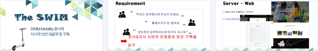 배경 목적 SWIM MoBility의 원활한 서비스를 위해 내·외부의 공격에 대비하여 보안 솔루션의 설계와 구축, 운영을 관리하는 것이 필요하여 진행하였다. |