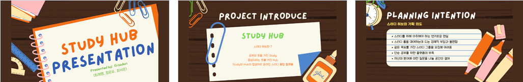 스터디허브는 온라인 스터디 그룹 개설 및 스터디룸 제공을 위한 서비스 플랫폼 입니다. 스터디 그룹의 개설을 제공하며, 제공된 스터디 그룹별 스케쥴과 스터디룸으로 그룹원들 간의 일정관리와 화면공유 및 채팅 기능을 제공합니다.